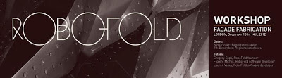 L'atelier RoboFold Facade Design & Fabrication workshop se déroulera sur cinq jours et étudiera un nouveau logiciel de conception de façades pour RoboFold. Il traitera principalement de la conception paramétrique pour les fabrication automatisée et se terminera par la fabrication d’une façade à l'échelle. L'événement se tiendra à Londres dans les installations de Robofold du 10 au 14 décembre 2012.